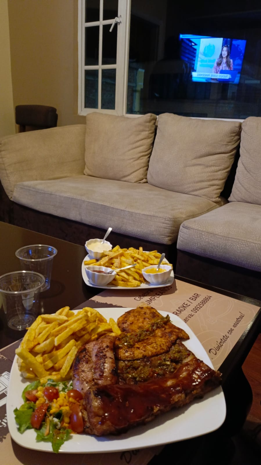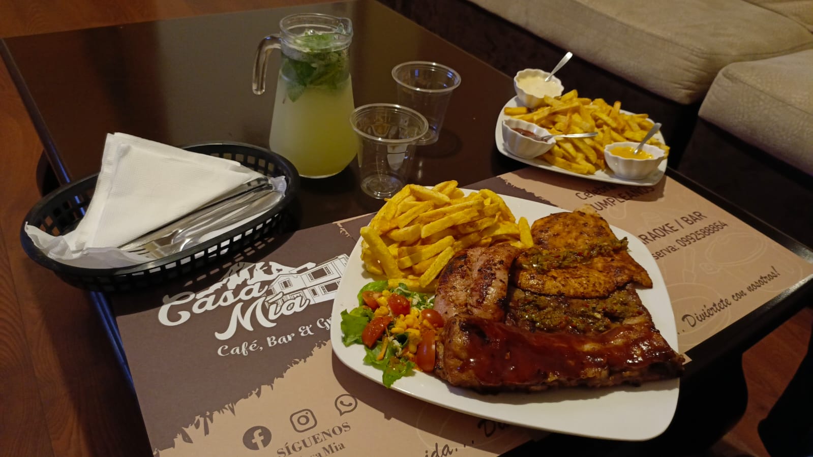 Las costillas BBQ son lo que la gente recomienda con más insistencia. No es casualidad: salen con una salsa que se queda marcada y con la carne en ese punto justo entre lo tierno y lo ahumado. La gente repite — y eso, en Riobamba, dice mucho.
